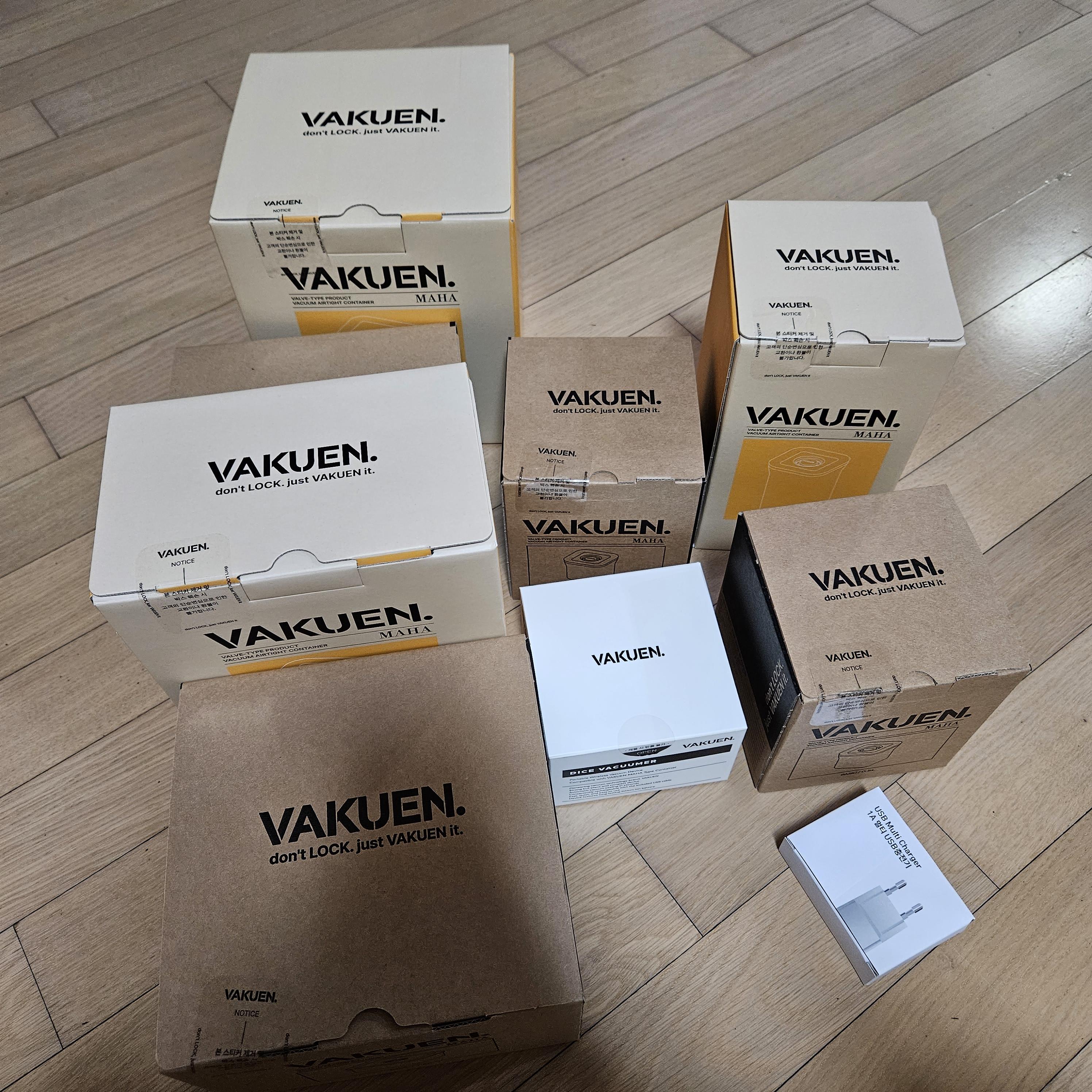 다양한 크기의 밀폐용기 7개와 충전기 그리고 진공기인 바큐머가 함께 옵니다.
