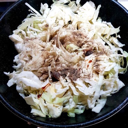 보기에는 별로인 것 같아도 꽤 맛있어요. 양배추는 숨이 죽으면서 달큼한 맛이 올라오기 때문에 특유의 양배추 냄새는 줄어들어요. 아예 냄새를 잡고 싶다면 후추를 넣어 숨이 아주 죽을 때까지 볶아주시면 됩니다.