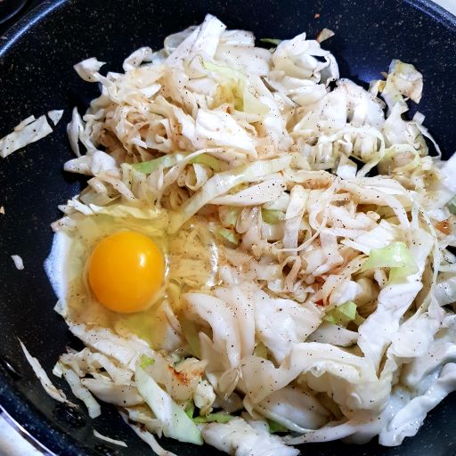 2. 양배추 숨이 살짝 죽으면 계란 1개를 넣고 함께 볶아줍니다.