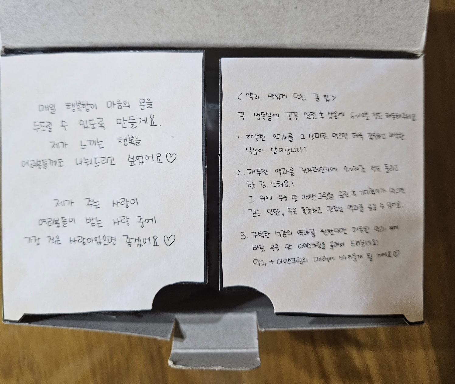 상자를 열면 손글씨로 봄날엔 약과를 맛있게 먹을 수 있는 방법이 쓰여있습니다. 이를 요약해 적었습니다.