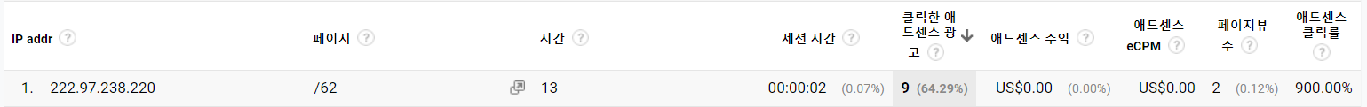이런 행동 정말 왜 하세요? 이 분은 오늘 오후 1시에 들어와 무려 2초 머무르면서 9번의 광고클릭을 하셨더라고요. 부산의 모 기업이던데 이런 행동은 정말 하지 맙시다.